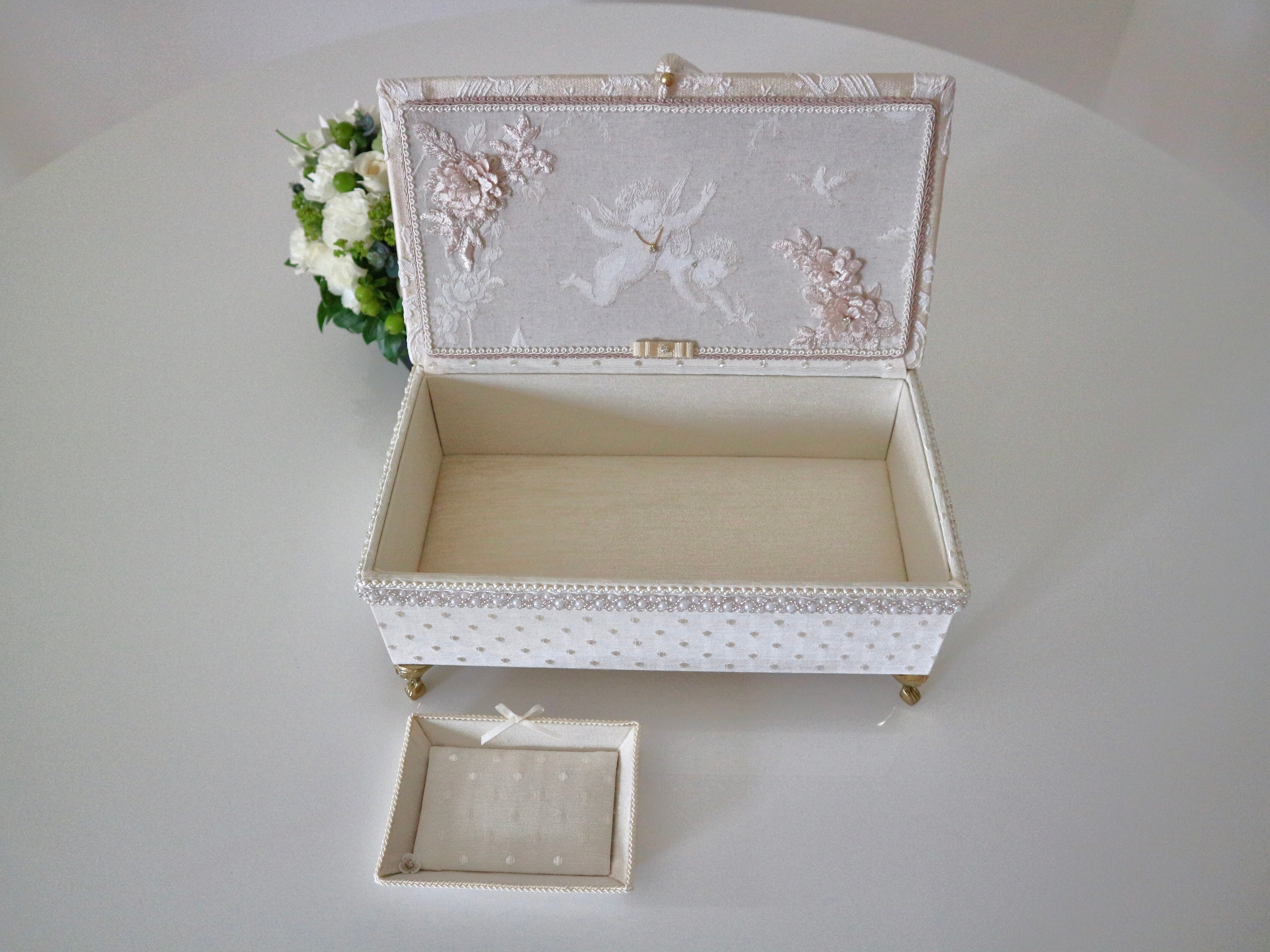 中はエンジェルの織り生地にお花のモチーフを合わせて立体感を出し、鳥と戯れるエンジェルにはピアスとネックレスをあしらいました。