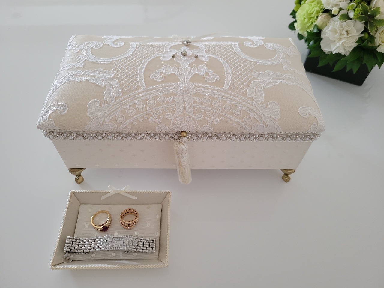 アイボリーの高級ジャガード生地に、ラインストーンとパール、ビーズをひと粒ひと粒づつ手作業で散りばめました。