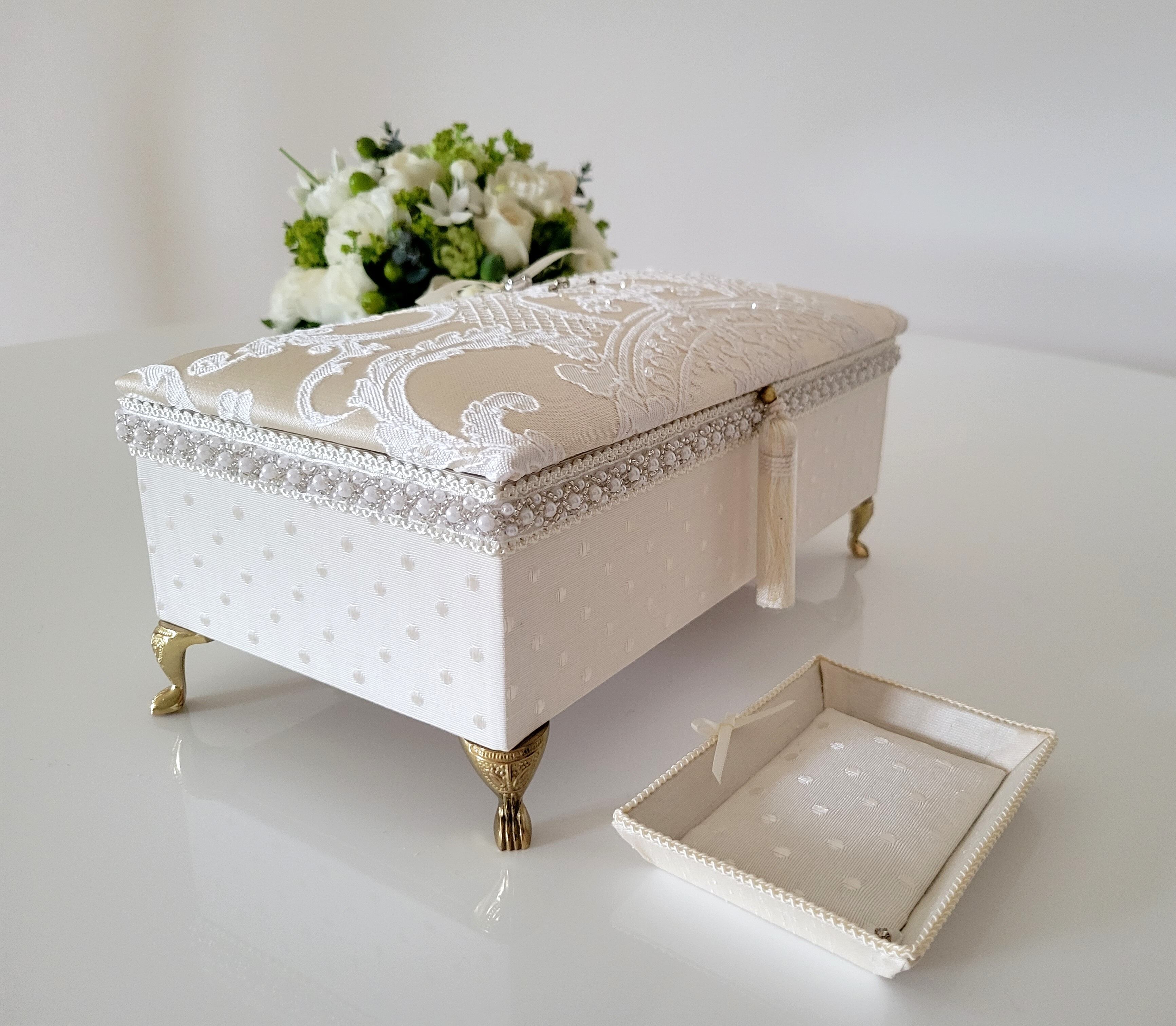 ボディはドットのグログラン生地にパールとビーズのブレードを合わせ、全体をオフホワイトでまとめた女性らしい上品なお財布ベッドが完成しました。