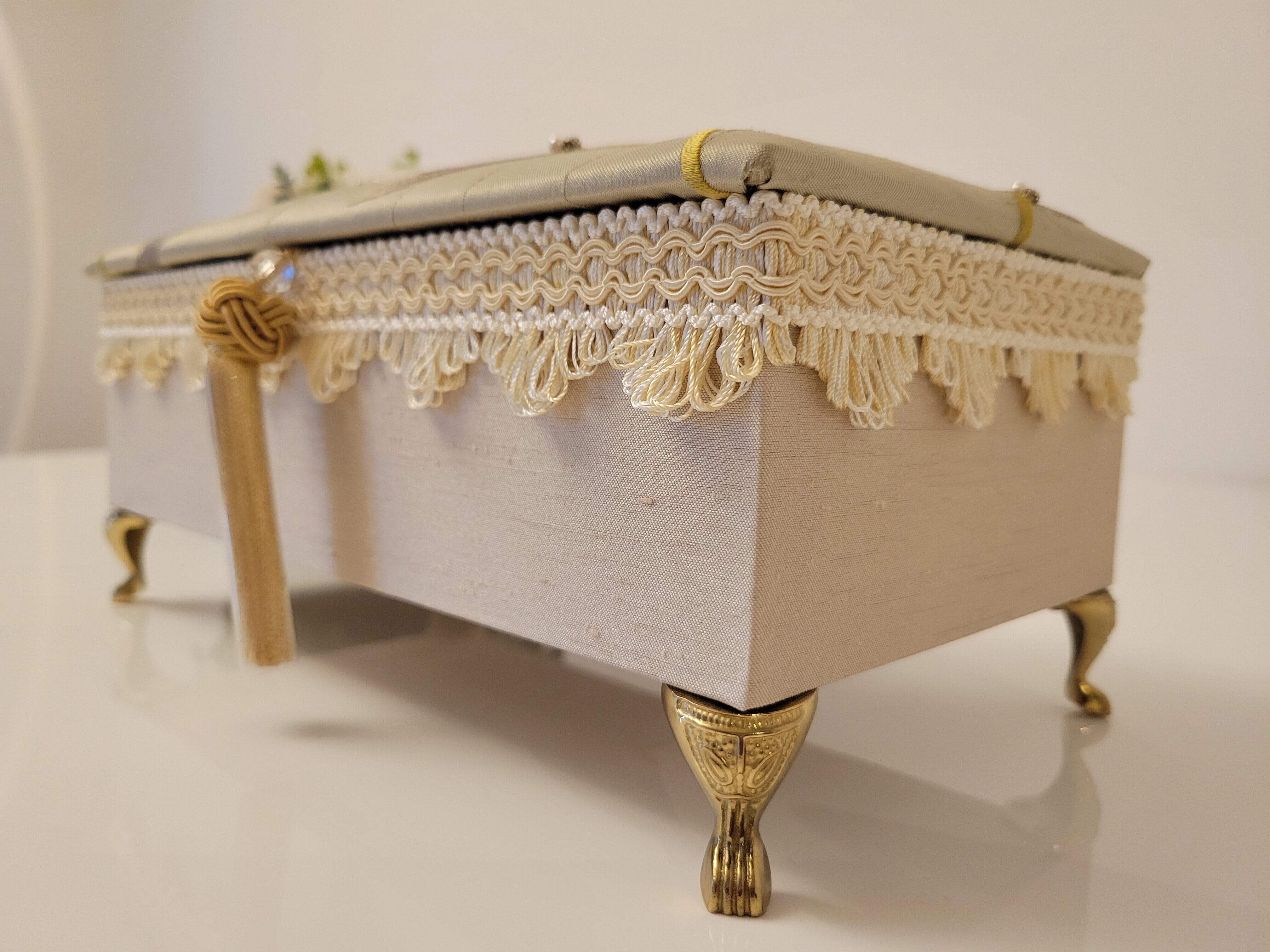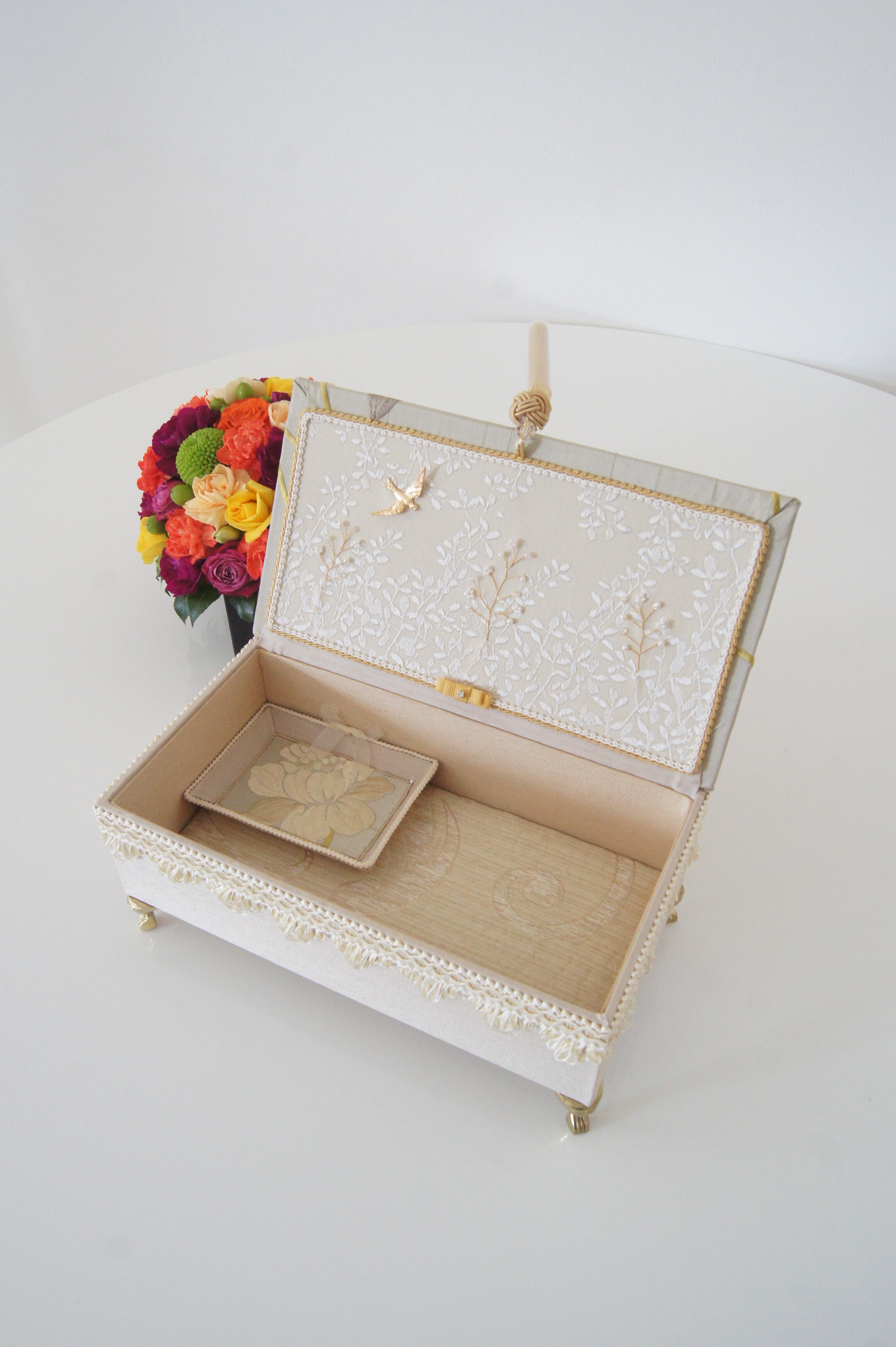 付属のミニトレイはシャンタンの生地とシノワズリーの生地で統一感のあるデザインなので、お財布ベッドと並べてアクセサリーや小物入れとしてもお使いいただけます。