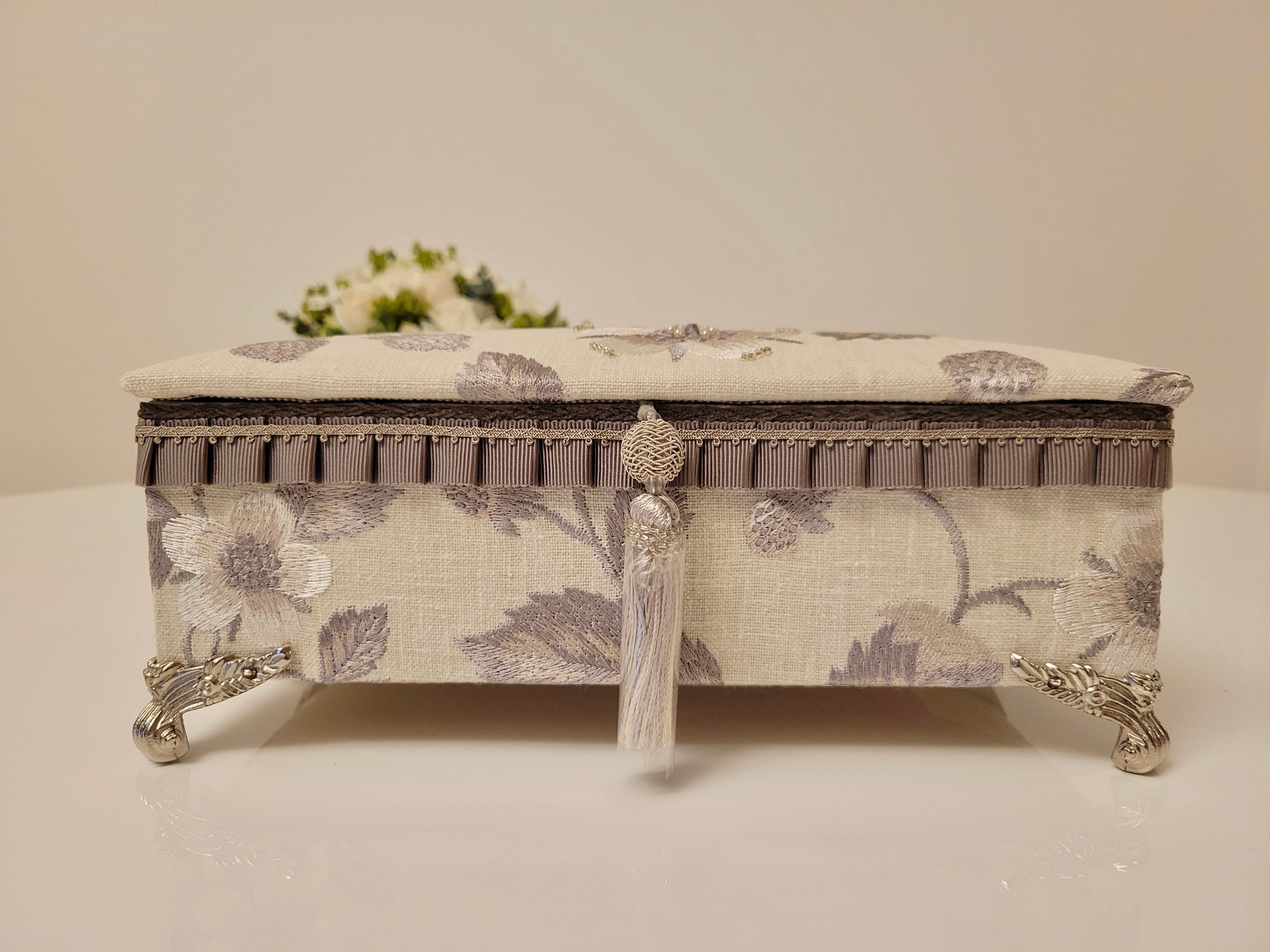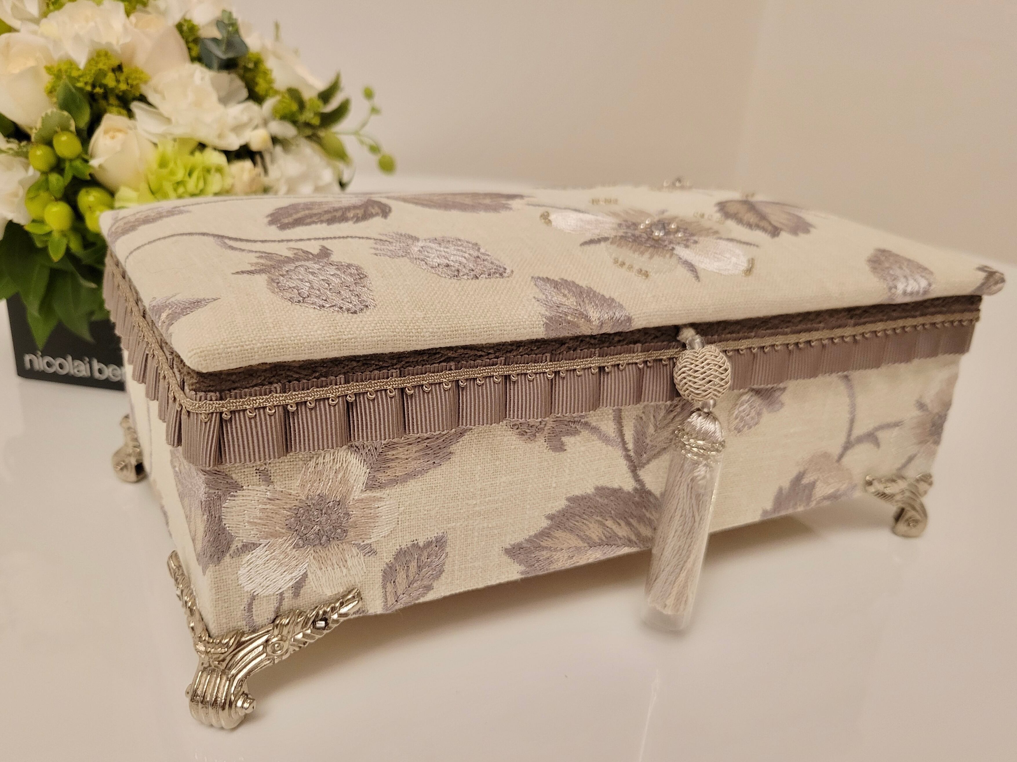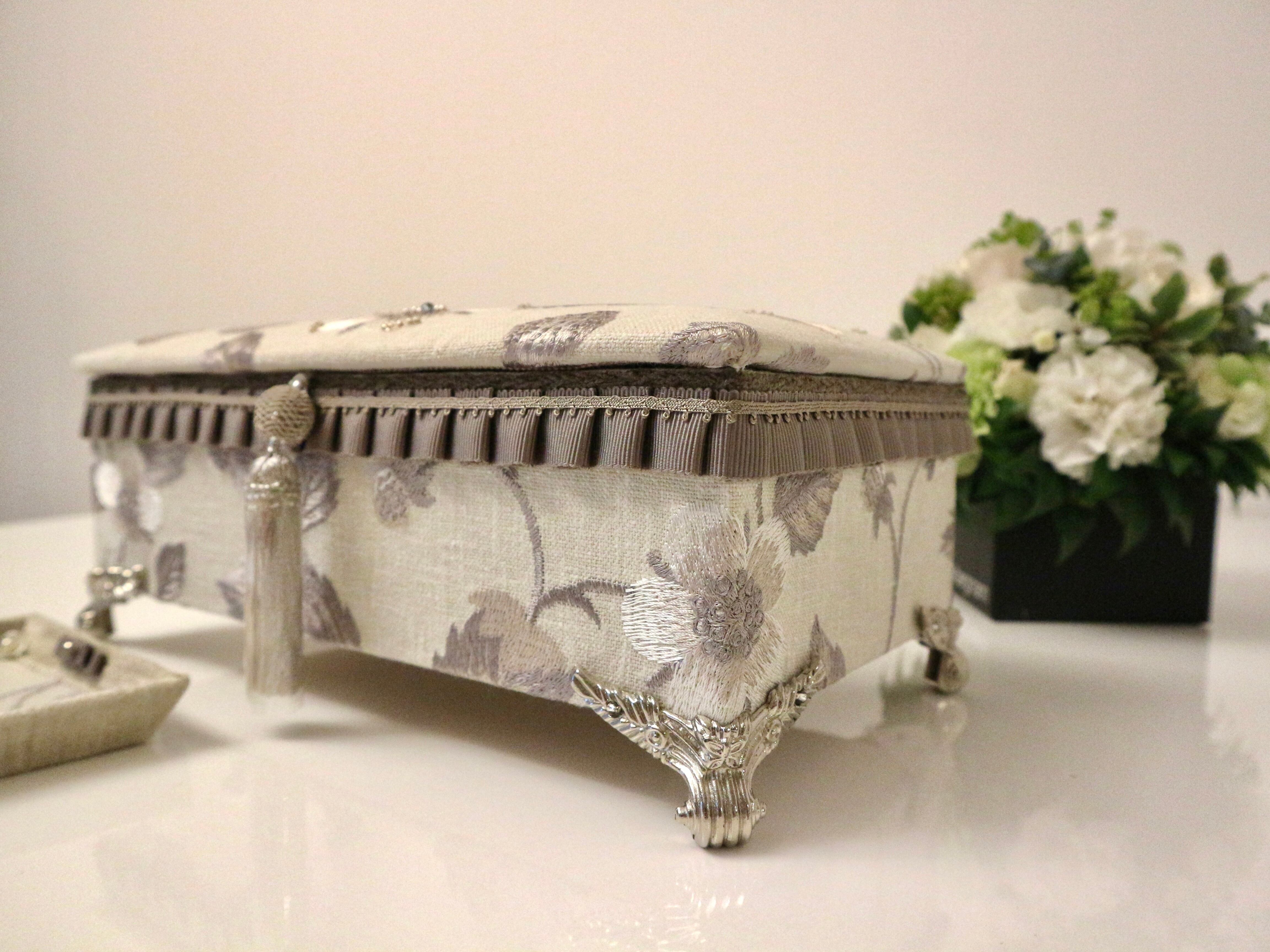 ボディも同柄の生地を使用し、グログランにプリーツを入れモールリボンと同色の細いブレードを組み合わせて作成したオリジナルのブレードが柄の刺繍とマッチして、可愛さと上品さを併せ持ったお財布ベッドとなりました。