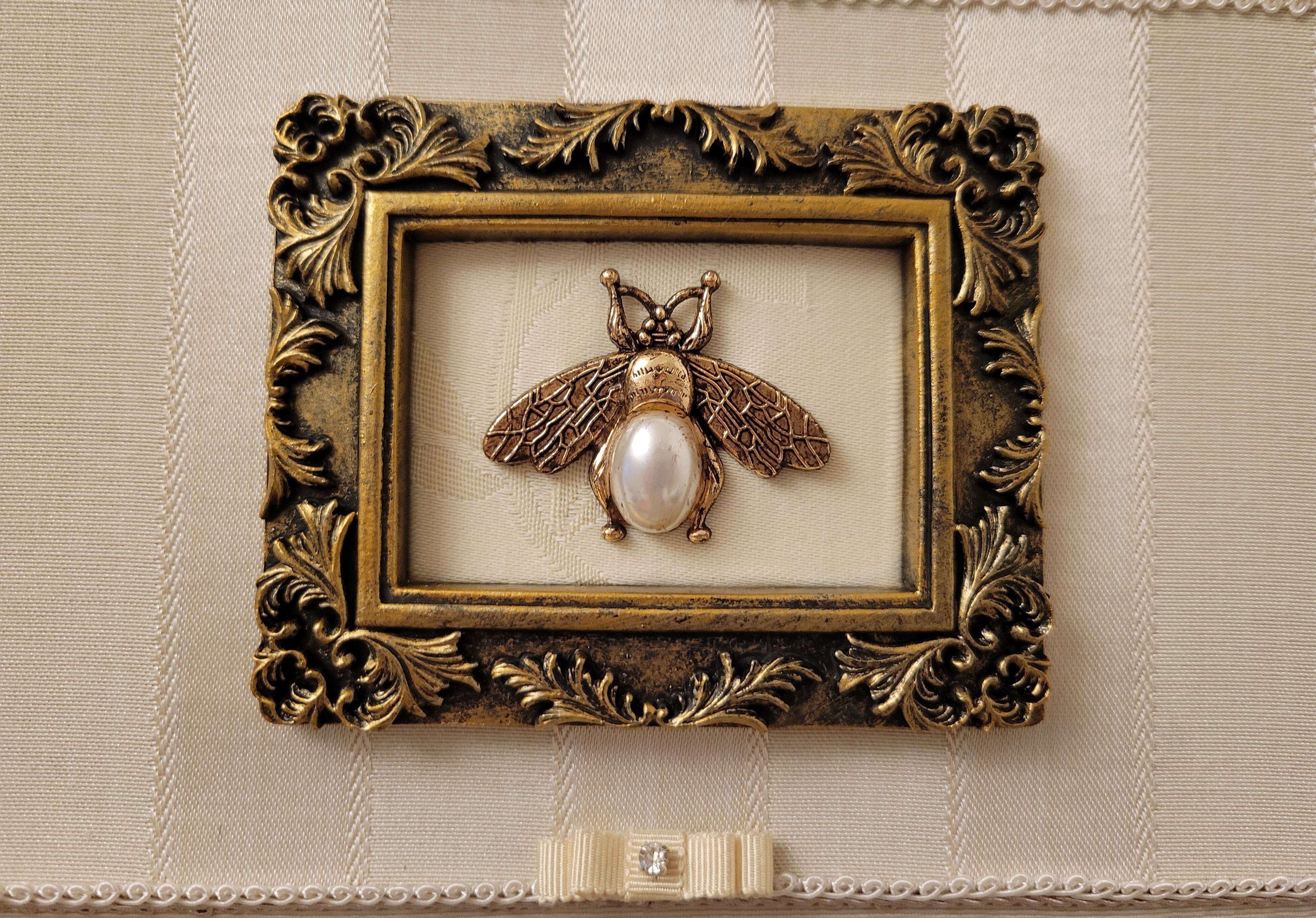 みつばちのモチーフをアンティークのゴールドフレームに入れて、ストライプのサテンジャガードや2色の細いブレード、グログランリボンなど様々なゴールドベージュを重ね、リッチに仕上げています。