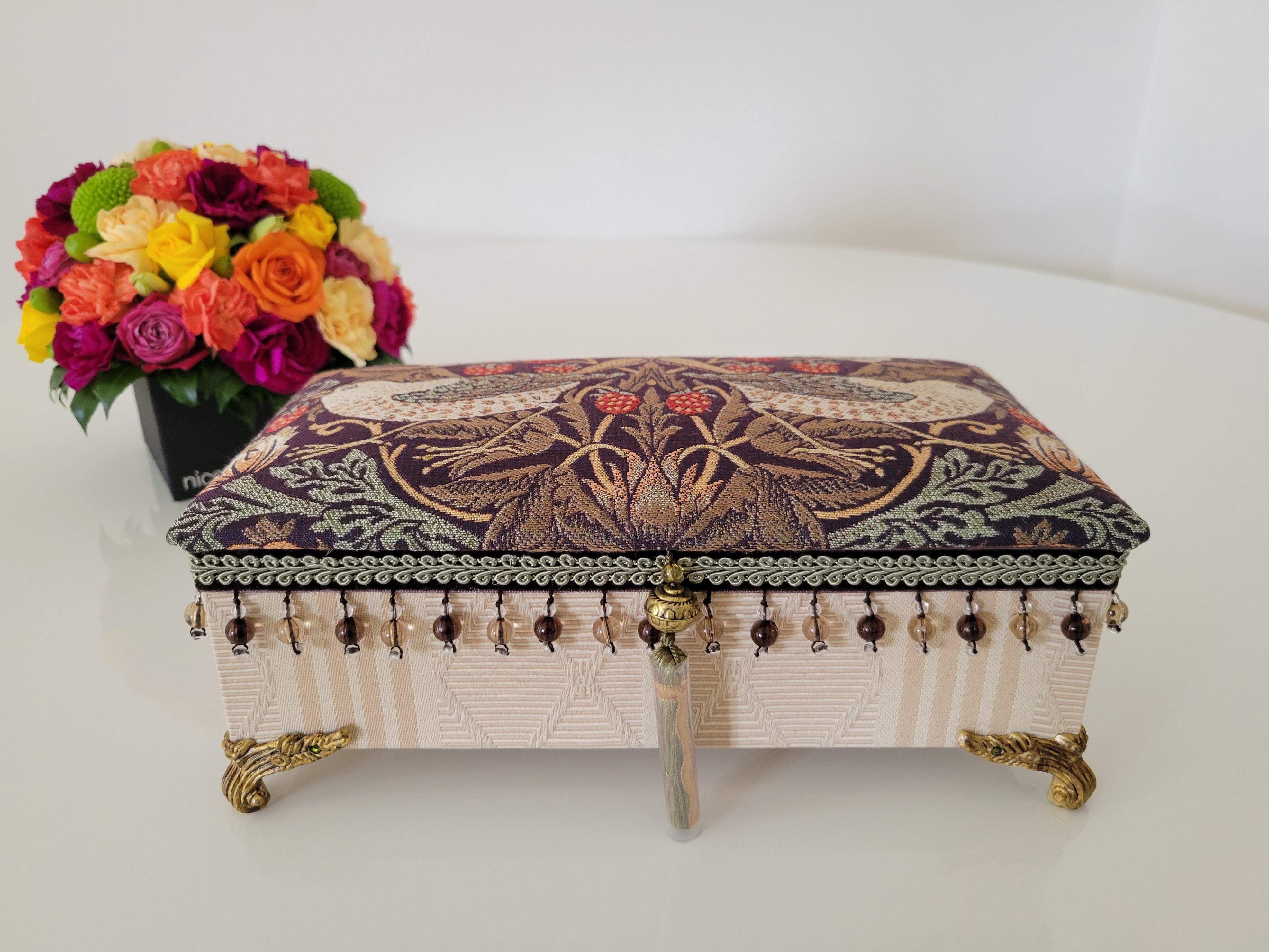 ボディは、ストライプとダイヤモンド柄ジャガード生地にいちご泥棒の生地の中の色をリンクさせたオリジナルのブレードとタッセルを組み合わせました。