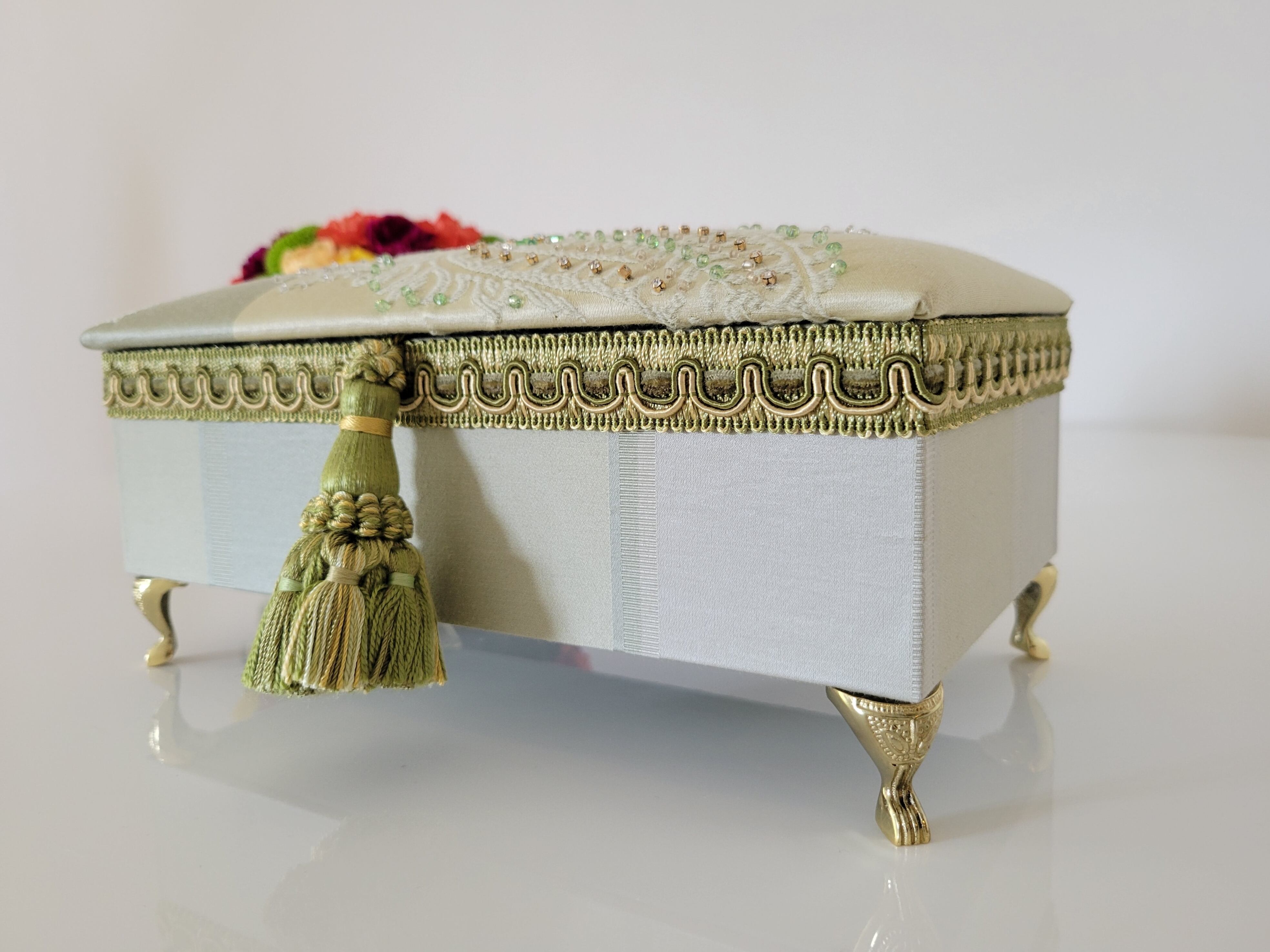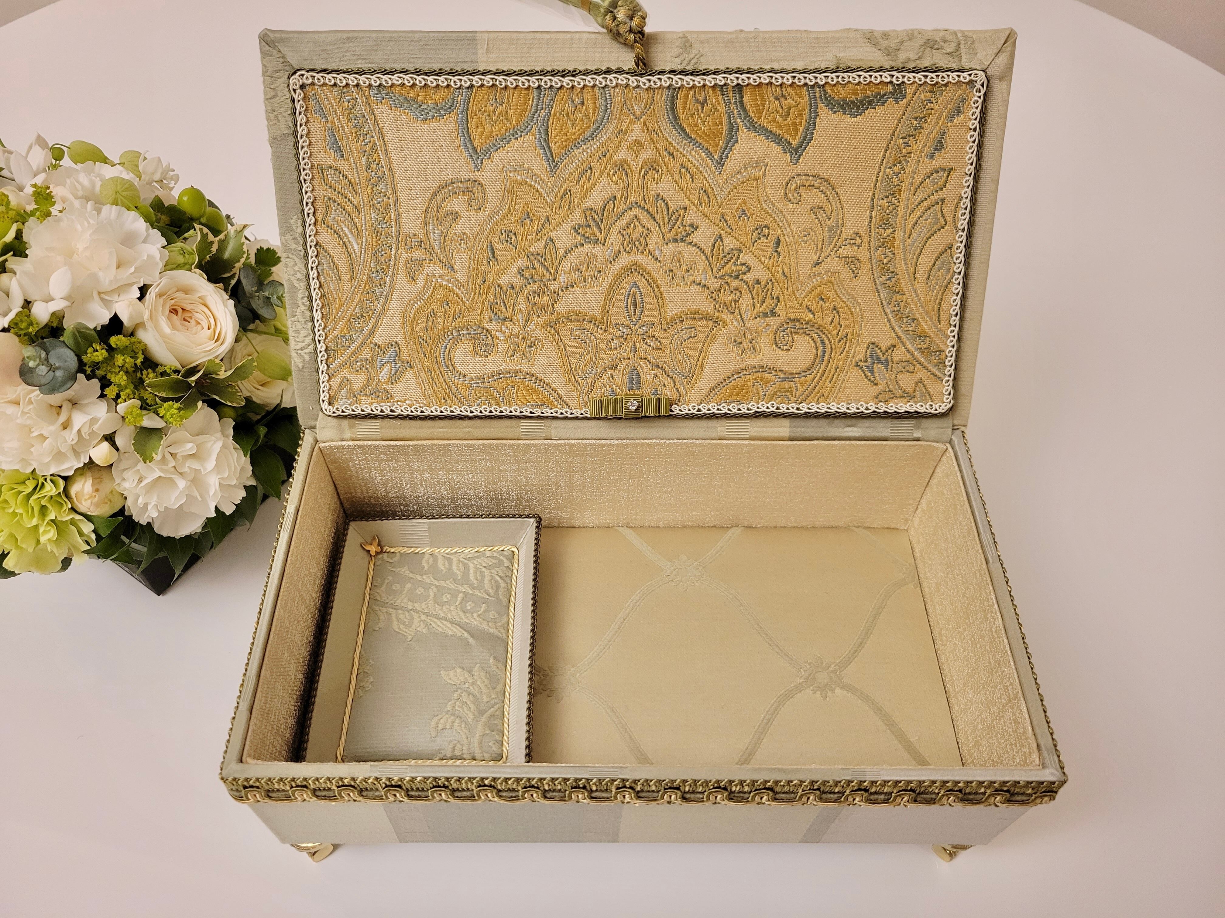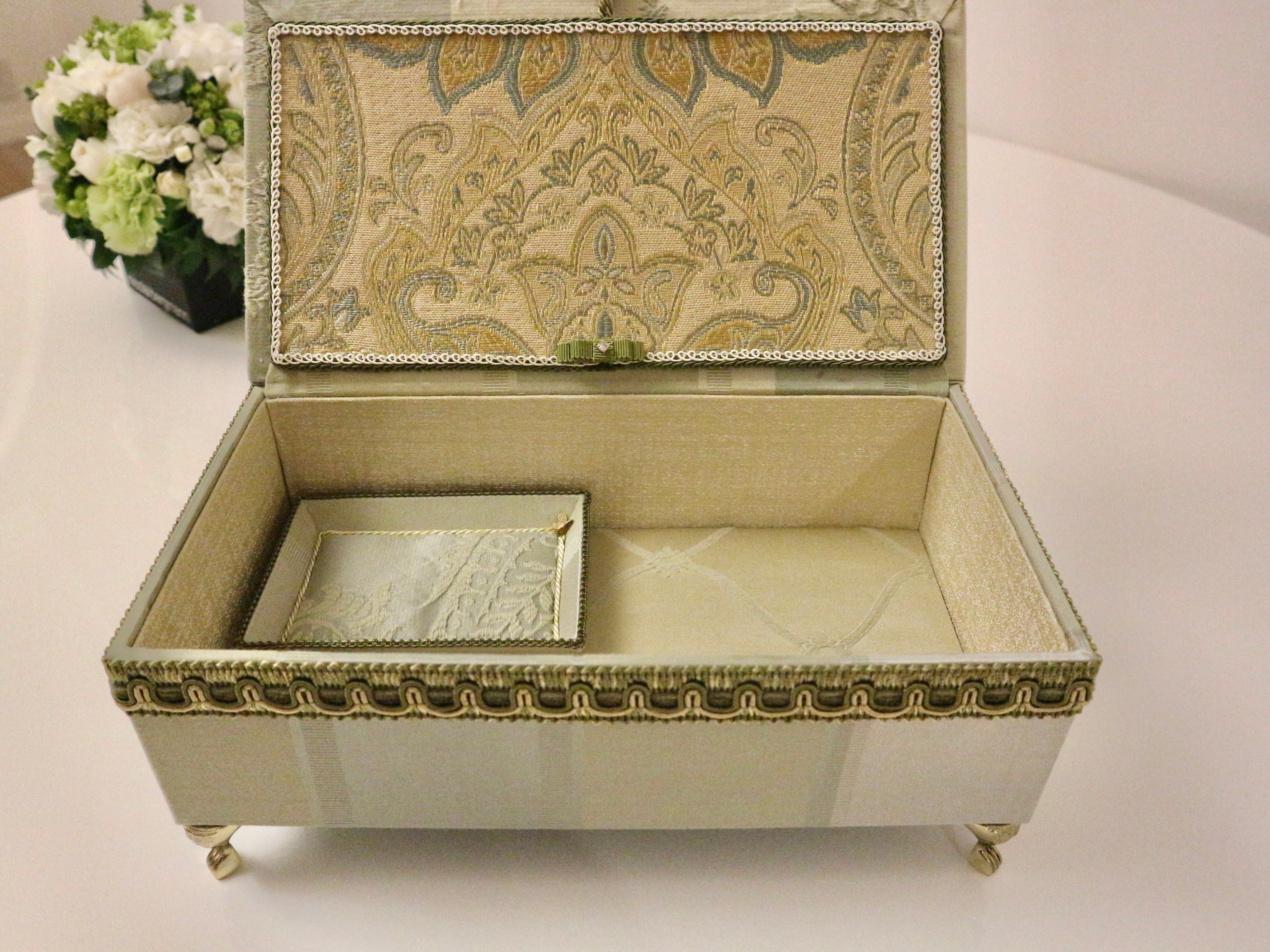 ボディも同系色のシルク100%のサテンストライプを使用し、グリーンとゴールドの幅広な高級ブレードを合わせています。タッセルも同系色のフランス製の高級タッセルを使い、存在感たっぷり。