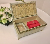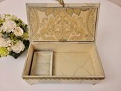 ペイズリー柄のピュアシルク生地にラインストーンやビーズを散りばめて立体感と輝きを出しました。